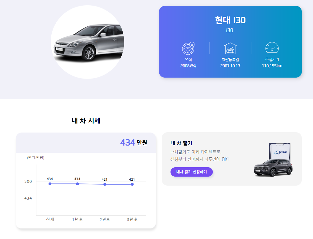 자동차365 보다 확실히 상세한 시세를 볼 수 있습니다. 내 차량의 종류, 연식, 차량등록일, 주행거리 등 상세 정보가 나오고, 현재 시세와 향후 3년후 시세까지 예측하여 알려줍니다.