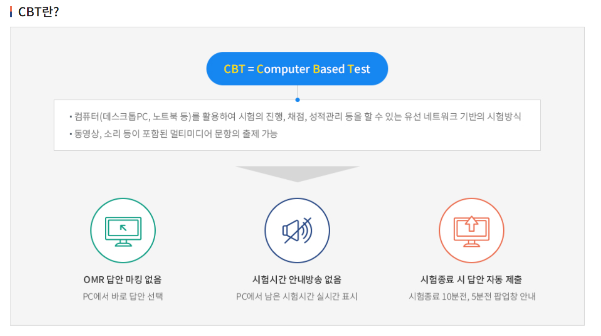 CBT는 컴퓨터 화면에서 문제를 보고 답을 선택하는 형식으로 이루어져 있어, 다른 종이 시험과는 다른 환경에서 시험을 보게 됩니다. 그래서 CBT 환경을 체험해보시고 시험에 응시하는 것이 좋습니다.